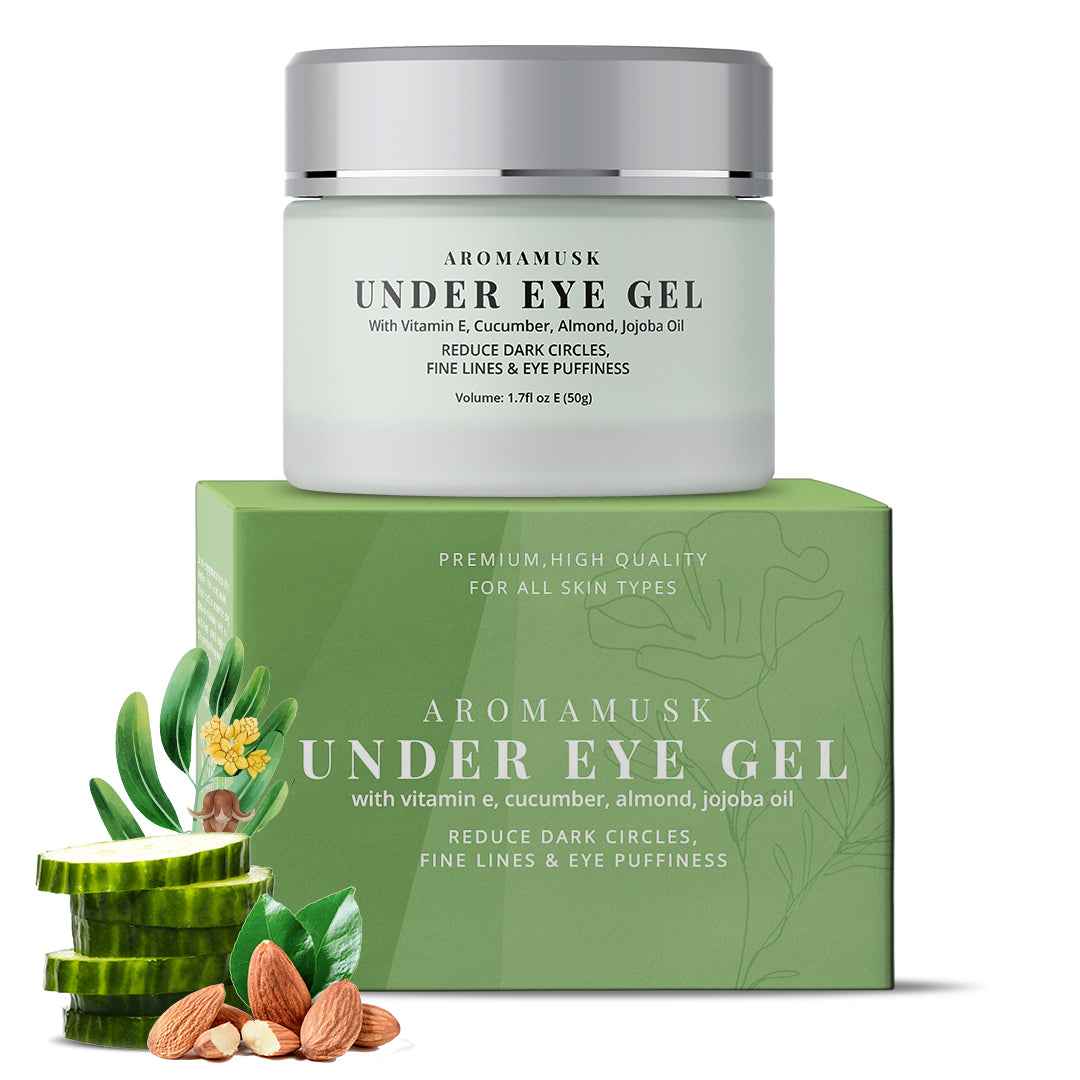 Start your day feeling bright and beautiful! Aromamusk Under Eye Gel with Goodness of Vitamin C, Niacinamide, Hyaluronic acid, Caffeine, Aloe Vera, and Cucumber rejuvenates tired eyes, reducing puffiness and dark circles.