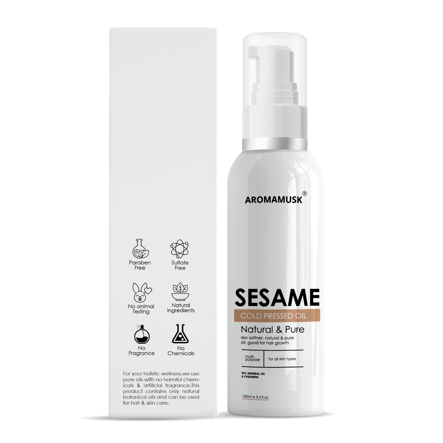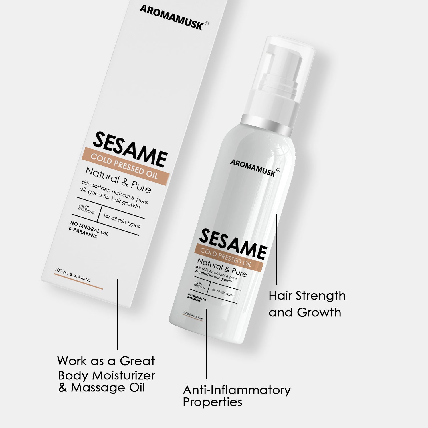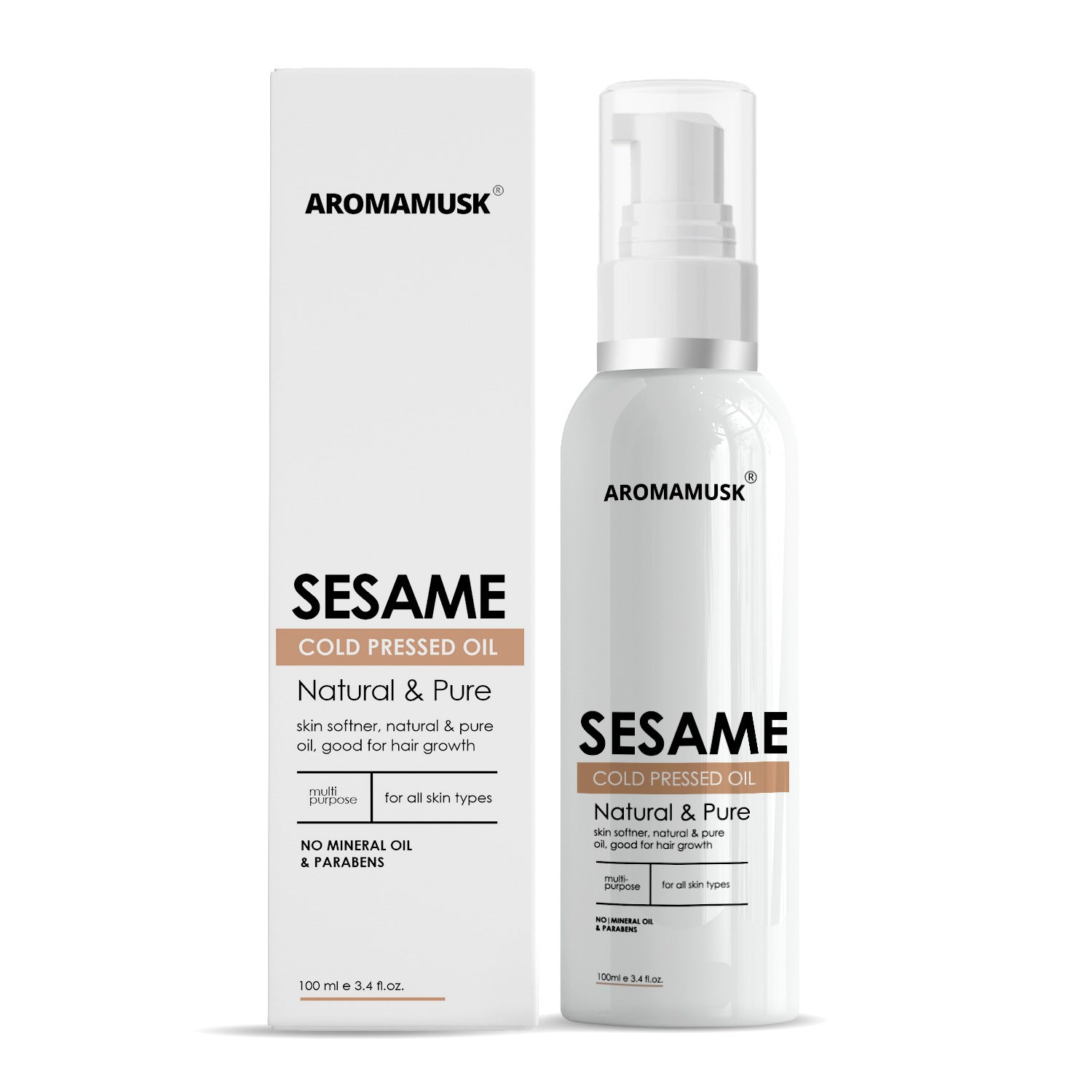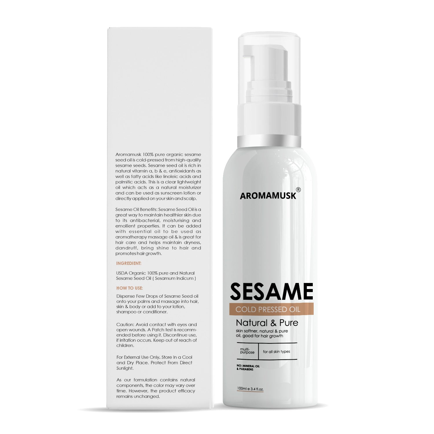 “AromaMusk 100% pure Organic Sesame Seed Oil is Cold Pressed from high quality sesame seeds. Sesame Seed Oil is rich in natural Vitamin E, A & B, Antioxidants as well as fatty acids like linoleic acids and palmitic acids. This is a clear lightweight oil which acts as a natural moisturizer and can be combined with shampoo, conditioner or can be directly applied on your skin and scalp. AromaMusk Sesame Seed oil is cold pressed from the seeds of Sesamum Indicum plant.